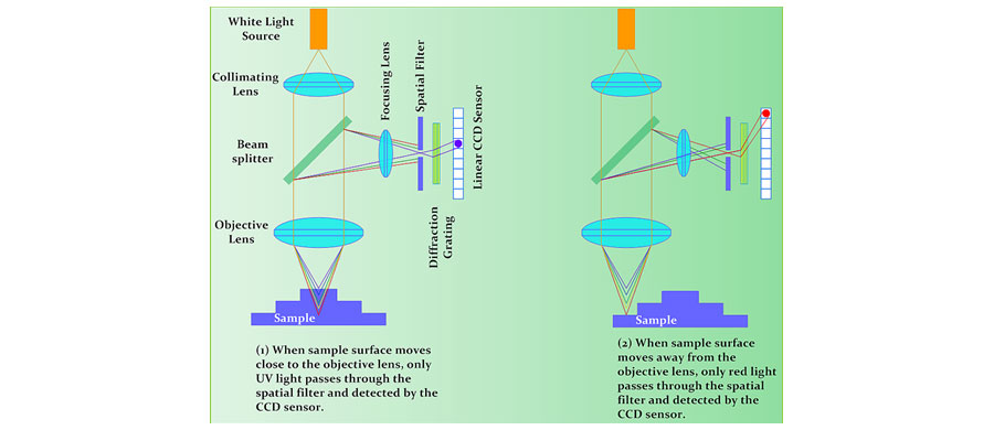 Un microscope confocal chromatique, utilise une lumière blanche (multi-spectres) qui permet de ne plus balayer en z et de mesurer également des échantillons non-transparents.