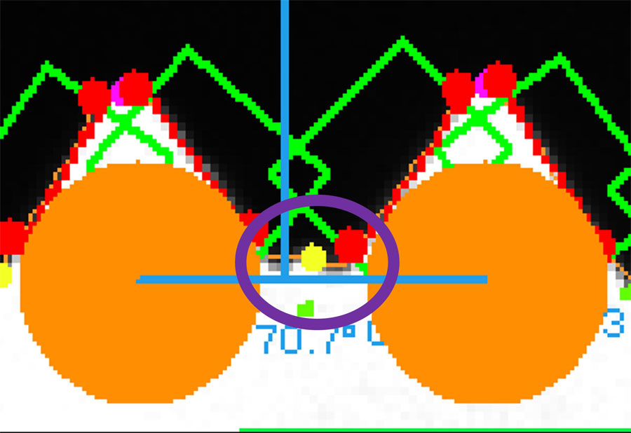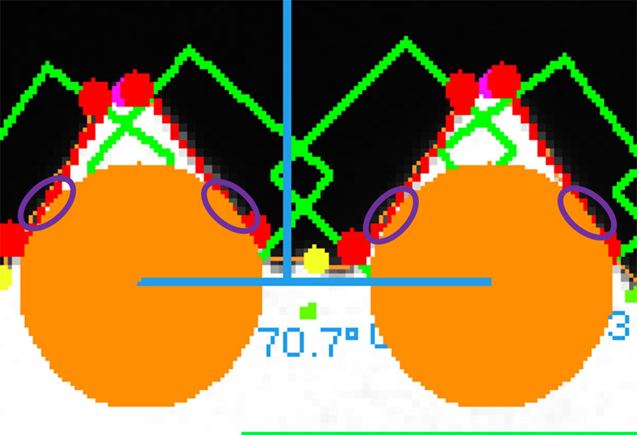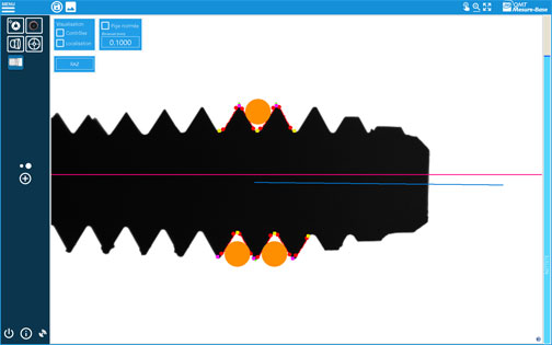 En raison de l’erreur induite à la vue de profil qui ne correspond pas à la réalité mécanique (à cause de l’inclinaison des dents), une table de corrélation a été créée et implémentée pour toutes les mesures de diamètres issues des piges virtuelles