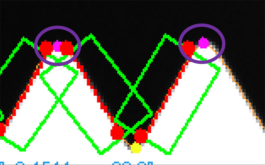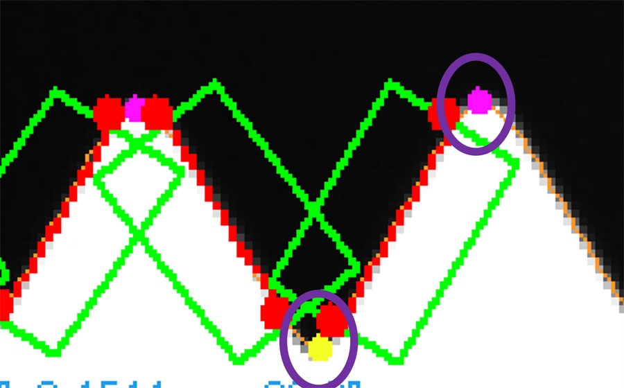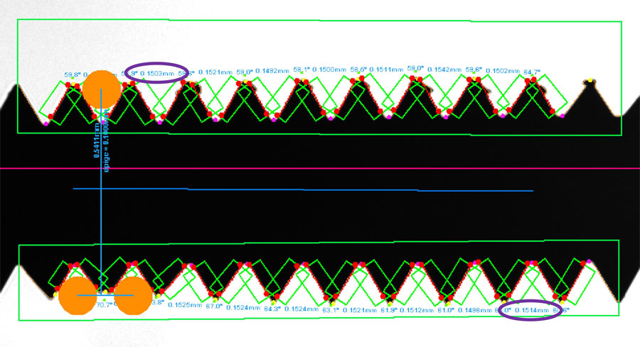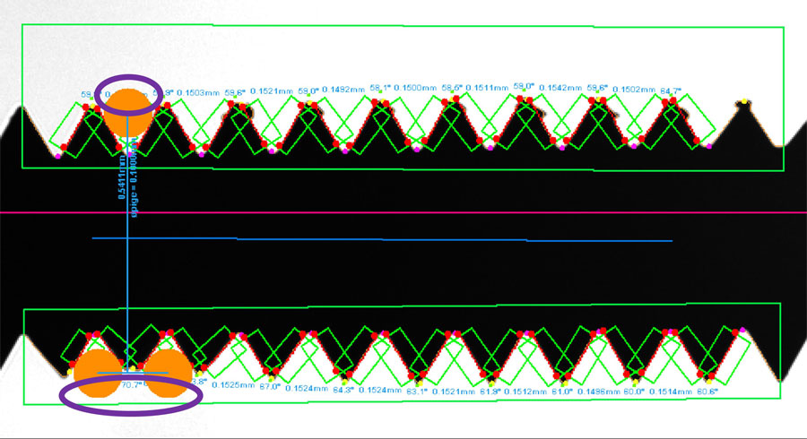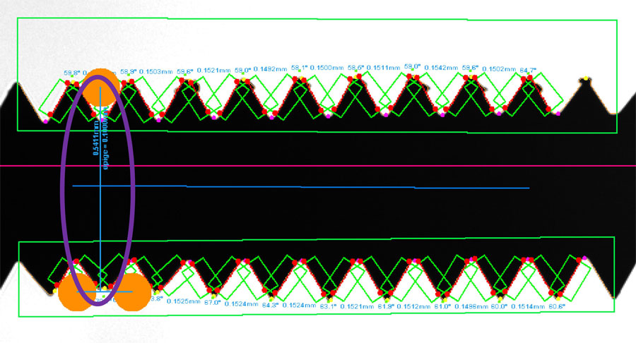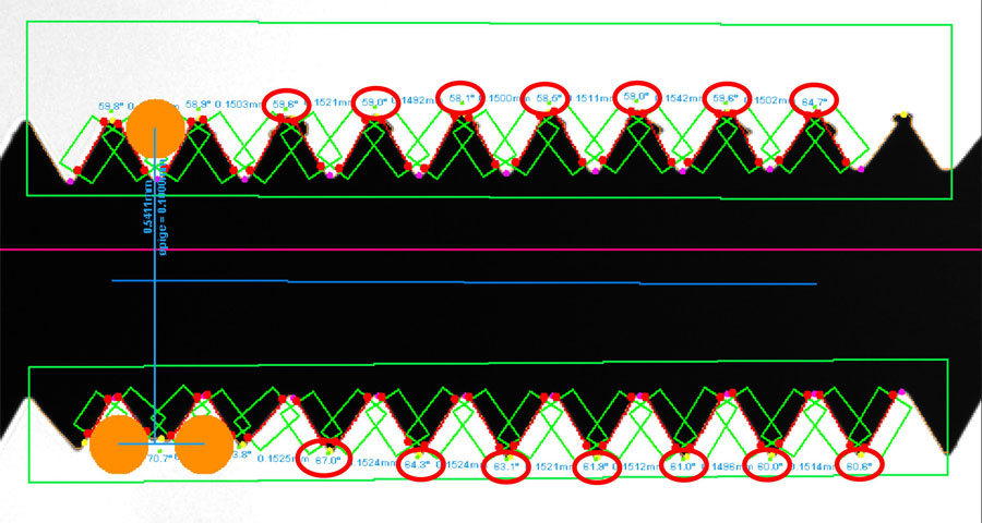 Le diamètre « sommet » est issu de la recherche du sommet réel depuis l’intersection des 2 flancs de chaque dent. Ce diamètre est la moyenne de tous les diamètres mesurés dans la zone :