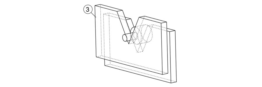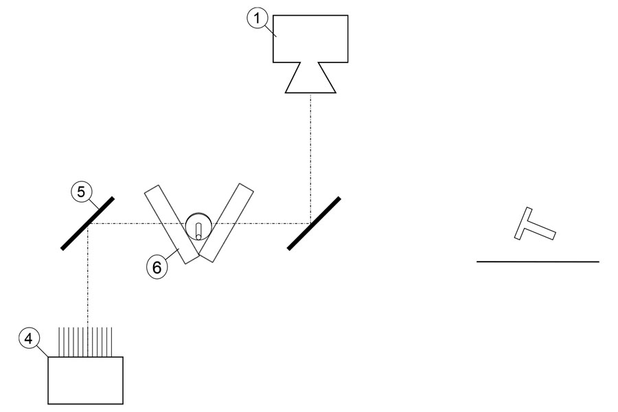 Pour ne plus supporter la pièce sur deux lames, la pièce peut être posée entre deux supports transparents plats (6) qui créent un certain angle entre eux. La pièce peut naturellement « pencher » à cause de la gravité. Le chemin optique de la lumière émise par la source (4) est modifié en utilisant deux renvois d’angle. Ainsi, l’image vue par le capteur (1) n’est plus une vue de dessus, mais de côté de la pièce et les dimensions vues correspondent à la réalité. Il n’est ainsi plus nécessaire de positionner précisément la pièce le long de son axe de rotation. Il n’est plus nécessaire non plus d’effectuer l’opération de dégauchissage.