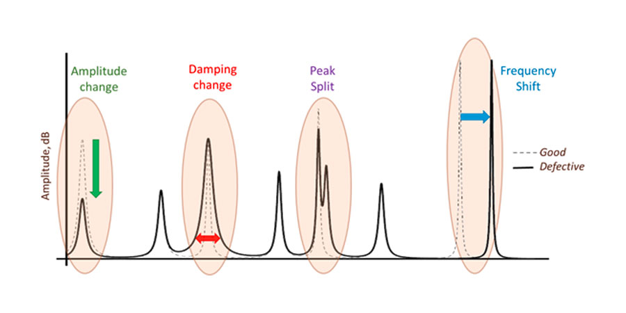 Un défaut change les propriétés élastiques de l’objet et donc son empreinte acoustique. La figure ci-dessus schématise quelques-unes des modifications de l’empreinte qui permettent de détecter un défaut dans une pièce par une inspection acoustique.