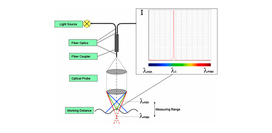Le principe de mesure confocal chromatique est basé sur la lumière polychromatique qui est classée en différentes couleurs spectrales en étant focalisée par un système optique à lentilles multiples à des distances variées du capteur. Plus que la lumière rouge à ondes longues (700 nm), la lumière bleue à ondes courtes (400 nm) est réfractée. Le début de la plage de mesure se fait avec la lumière bleue, tandis que la fin se fait avec la lumière rouge. Chaque longueur d'onde se trouve dans un plan focal différent en raison de l'aberration chromatique contrôlée. Chaque longueur d'onde est assignée avec une distance spécifique à la cible par un calibrage en usine. Dans le cas d'un système de capteurs, cette longueur d'onde de lumière est utilisée pour la mesure qui est précisément focalisée sur la cible. La lumière qui est réfléchie est reproduite par un dispositif optique sur un élément de capteur sensible à la lumière, sur lequel la couleur spectrale correspondante est détectée et évaluée. Une partie de cette lumière est réfléchie à chaque changement d'indice de réfraction des différents matériaux, ce qui permet de mesurer l'épaisseur des matériaux transparents, même d'un seul côté. Dans les mesures multi-crêtes, un certain nombre de points de distance sont évalués.