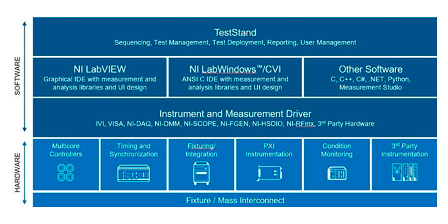 L'environnement TestStand est intégré à notre plateforme qmt avec une capacité à implémenter plus rapidement des fonctionnalités tel que les IHM personnalisées, les processus applicatifs, l'acquisition et la génération de signaux, la communication et la génération des rapports selon le format souhaité.
