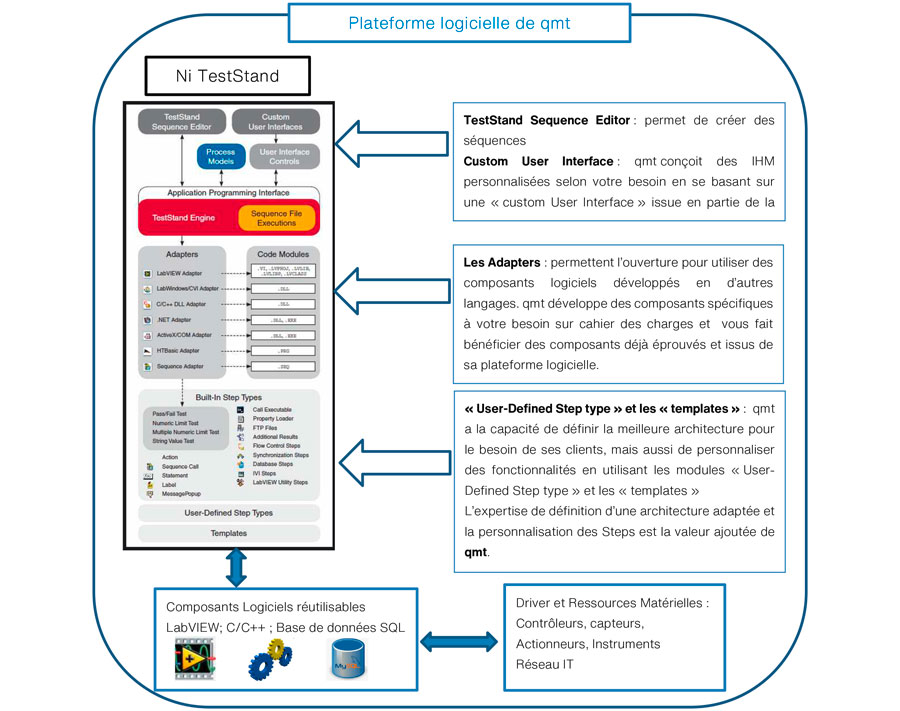 qmt a intégré TestStand à sa plateforme logicielle, permettant ainsi à nos clients de bénéficier de nos 30 années d’expérience et de capitalisation. Notre plateforme logiciel intègre de multiples composants déjà éprouvés, robustes et réutilisables. Cette approche basée sur la réutilisation et la définition d’architectures adaptées permet d’accélérer les développements tout en livrant des solutions robustes