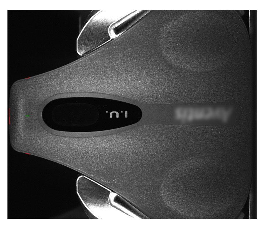 Le produit ets un capot plastique de 18mm de largeur, 12mm de hauteur et 100mm de longueur. L'image du produit est réalisée avec une caméra linéaire avec une rotation du produit. L'acquisition des lignes synchroniées à la rotation permet la création d'une image comme si on avait aplati le produit. L'éclairage doit permettre l'observation de zones transparentes, structurées, mates et brilliantes.