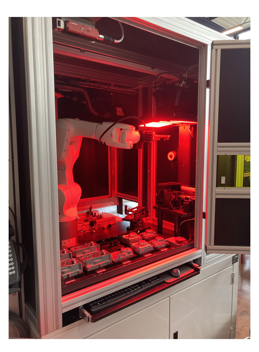 qmt a développé des stations de mesures permettant le contrôle de qualité de carters en fonte d’aluminium pour SONCEBOZ. Le but de la solution est de contrôler les surfaces usinées de pièces après lavage. Les 3 stations de vision sont intégrées dans une cellule robotisée qui est en ligne dans le processus de fabrication.