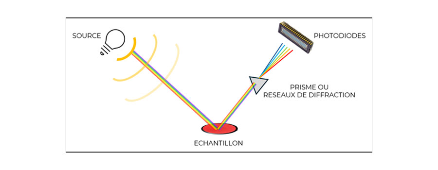 Ils n’utilisent pas des filtres mais analysent la distribution spectrale de la lumière réfléchie ou transmise par un échantillon. La lumière est divisée en ses longueurs d'onde constitutives à l'aide d'un prisme ou d'un réseau de diffraction [5]. Ils mesurent ensuite l'intensité de chaque plage de longueurs d'ondes. Cette méthode permet aux spectromètres de fournir des mesures très précises et détaillées de la couleur, capturant des informations spectrales complètes qui offrent une compréhension approfondie des propriétés colorimétriques des matériaux.