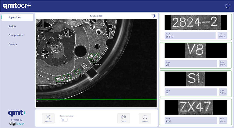 Le module DigiOcr intégré dans le logiciel qmtocr est spécialisé pour l’horlogerie. Cet algorithme Deep Learning de lecture de caractères est entraîné sur plusieurs milliers de polices et il est complété par un traitement spécifique pour robustifier et faciliter son utilisation en milieu industriel. Un réentrainement du coeur est possible pour une adaptation aux cas particuliers