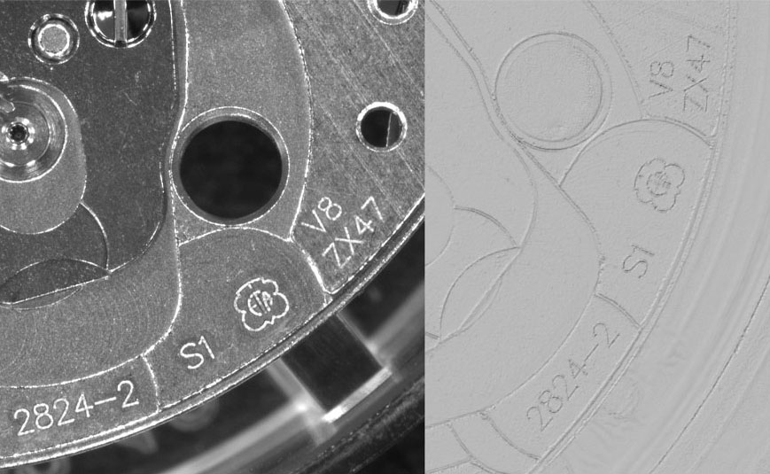 L'éclairage qmtrelief permet la création d'une image sans les informations de couleur et structure de la surface, seul le relief est visible. Il est ainsi possible d'améliorer la lisibilité des numéros gravés en particulier sur une surface décorée